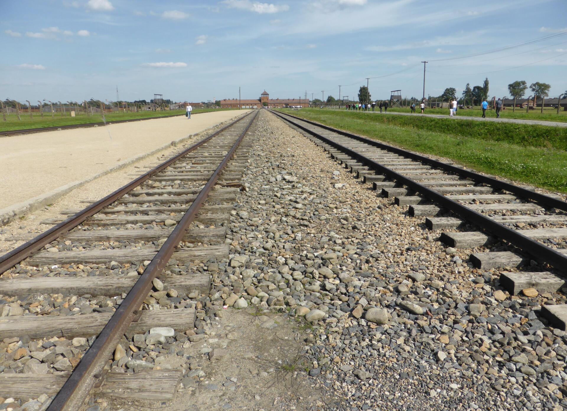 Auschwitz 2 (Birkenau): Blick von der Selektionsrampe zurück zur Einfahrt